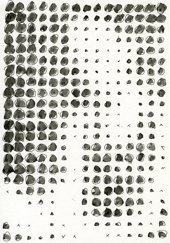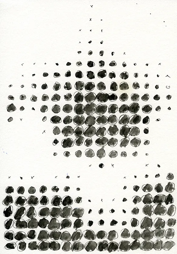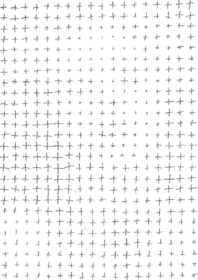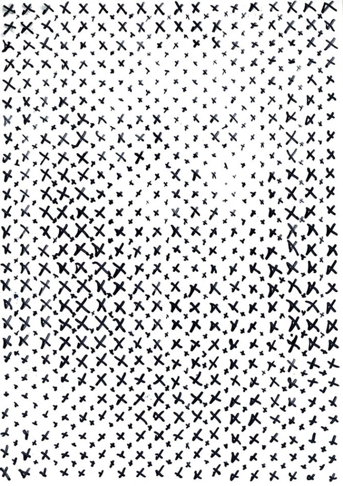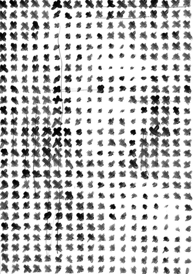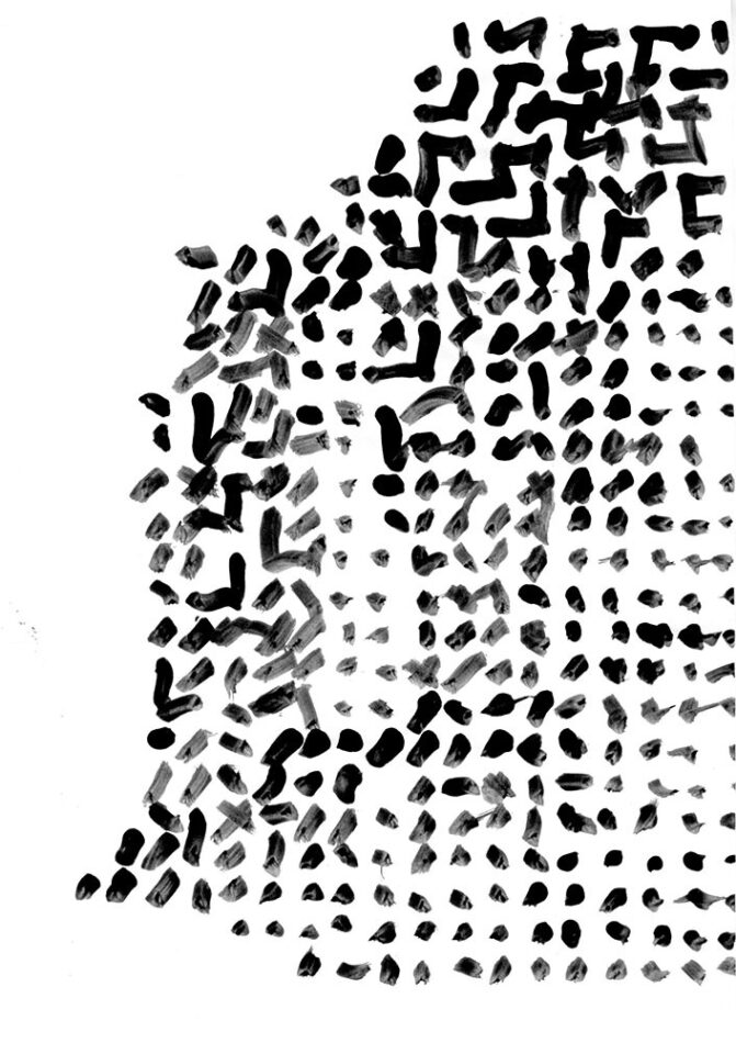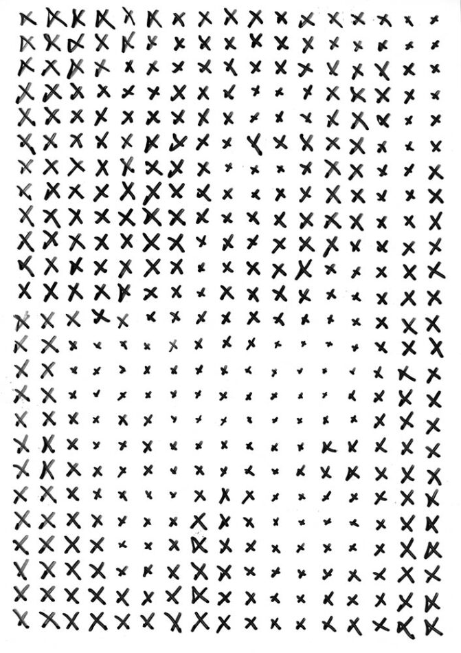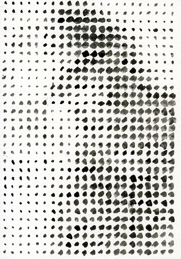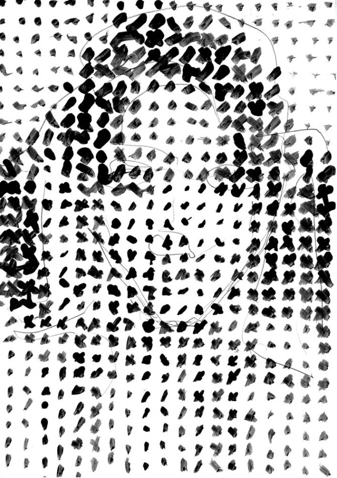 Das methodische zerlegen von Realem in Einzelteile. Reduktion der Farbe – eine Komposition in Schwarz und Weiß. Die Auflösung ist Anordnung und Maßeinheit. Weiterführend sehe ich das Porträt nicht nur als Spiegelbild einer Person sondern als gesellschaftskritisches Abbild. Eine Selfie Generation.